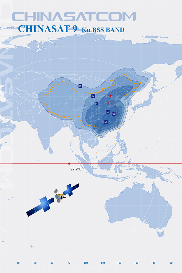 中星9號衛星于2008年6月9日由長征三號乙運載火箭發射,定點于東經92.2度同步衛星軌道,提供22個BSS頻段轉發器直播服務,是一顆大功率、高可靠、長壽命的廣播電視直播衛星。