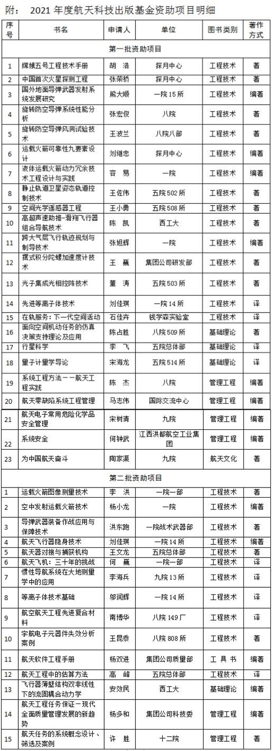 通過(guò)兩次評(píng)審,共有38個(gè)項(xiàng)目獲得2021年度基金資助,年資助數(shù)量再創(chuàng)新高。2021年是航天科技圖書出版基金設(shè)立的第十五年。15年來(lái),評(píng)審委員會(huì)辦公室共收到申報(bào)項(xiàng)目454個(gè),其中367個(gè)項(xiàng)目通過(guò)評(píng)審,248種圖書已經(jīng)出版。評(píng)審委員會(huì)還研究了開(kāi)展航天科技圖書出版基金優(yōu)秀獎(jiǎng)評(píng)選活動(dòng)的有關(guān)事項(xiàng),2022年將開(kāi)展首次優(yōu)秀圖書獎(jiǎng)和優(yōu)秀組織獎(jiǎng)評(píng)選工作。(科軒)