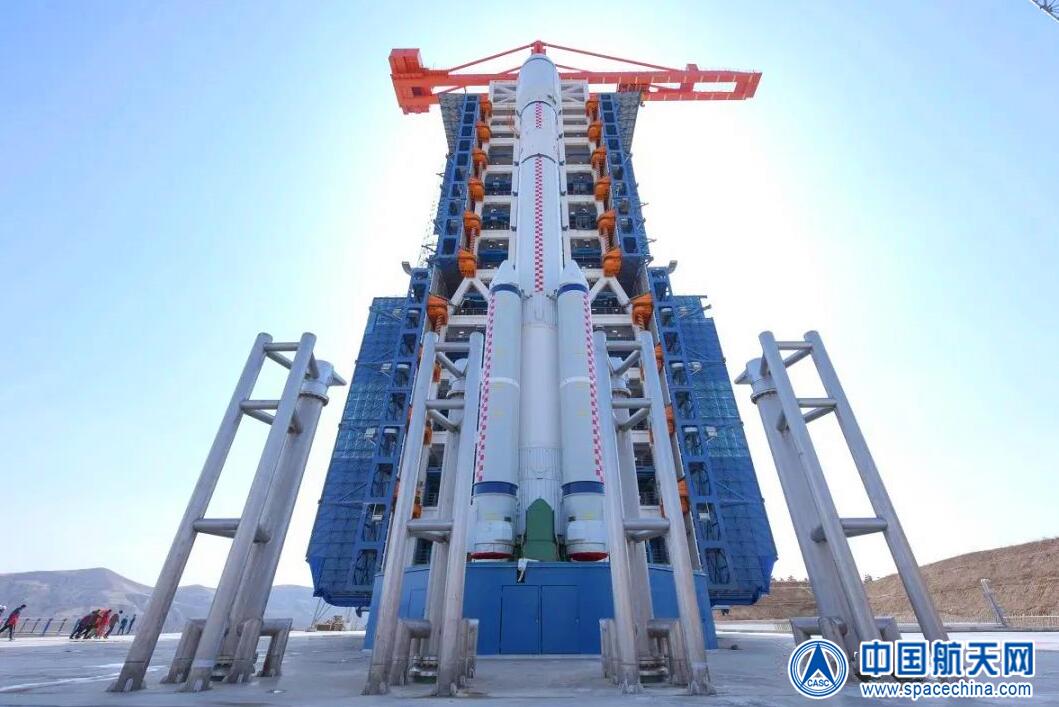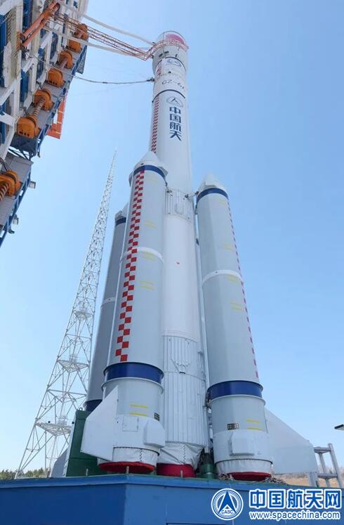 長六改火箭矗立在塔架旁