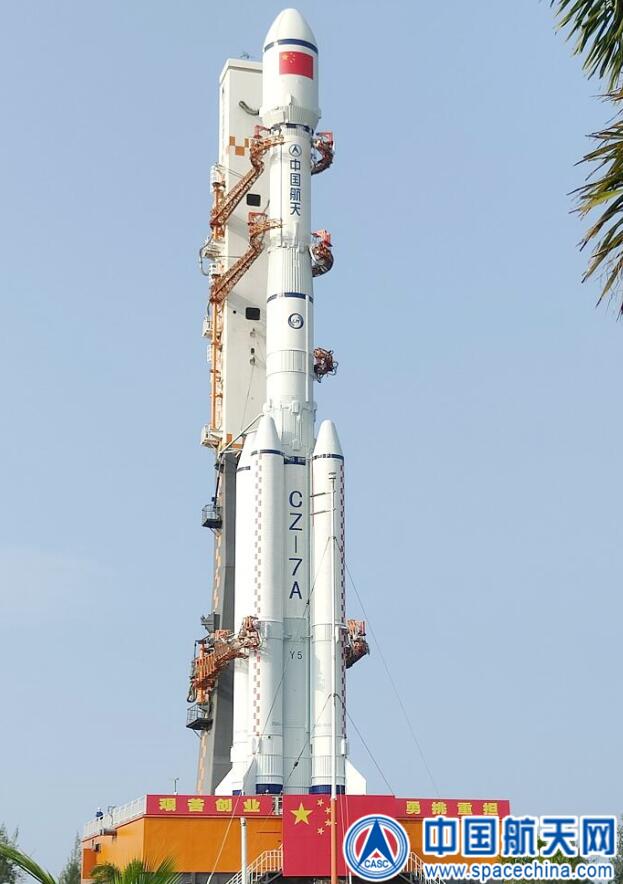 長征七號A運載火箭是由中國航天科技集團有限公司一院研制的三級液體捆綁式新一代中型高軌運載火箭。本次任務火箭采用4.2米直徑整流罩,全箭總長60.1米,起飛重量約570噸,起飛推力727噸。