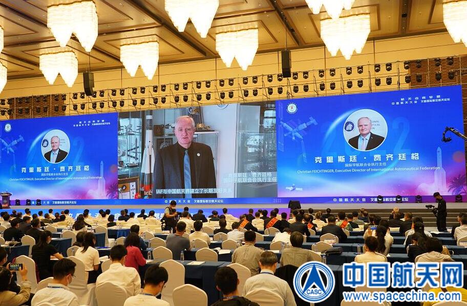 大會開幕式上,國際宇航聯合會執行主任克里斯汀·費奇廷格通過視頻致辭。