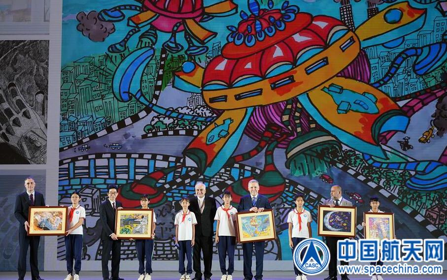 大會開幕式上舉行了“我的太空夢”航天主題繪畫贈禮。來自海南省文昌市龍樓鎮航天小學的小朋友們展示了精心創作的繪畫作品,分享了背后的創作故事,并向外賓贈送作品。