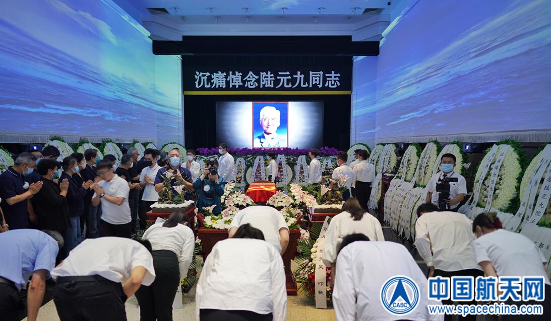 早上9點(diǎn),上千人聚集在八寶山殯儀館東禮堂門前,陸元九同志的同事、親友、學(xué)生、晚輩前來送他最后一程。禮堂門前掛起挽聯(lián):“殫精強(qiáng)國 一縷英魂存海宇”“竭慮宇航 滿腔熱血貫云天”。陸元九同志的遺體安臥在鮮花之中,身上覆蓋著鮮紅的中國共產(chǎn)黨黨旗。
