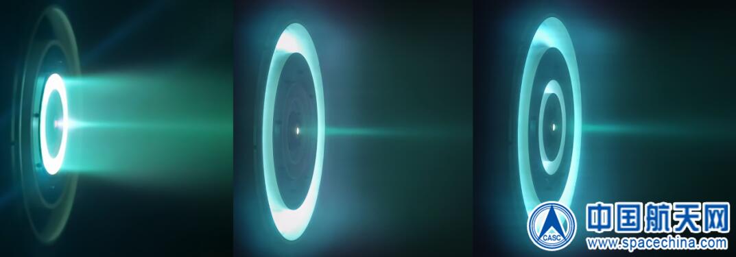 圖為嵌套式霍爾推力器點火圖像(左:內環工作,中:外環工作,右:雙環同時工作)。801所供圖