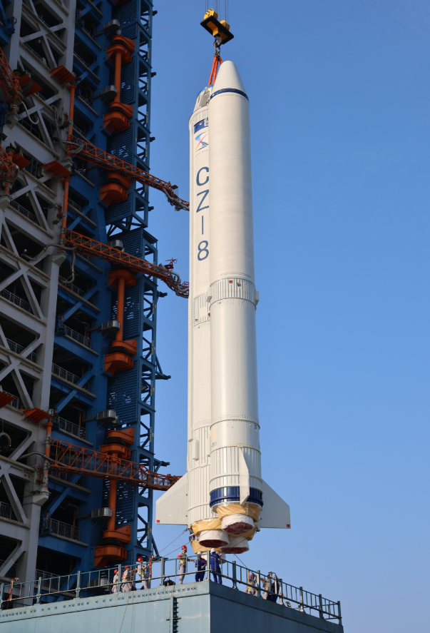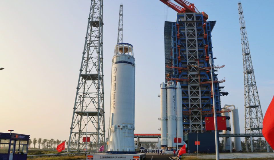 10月31日,長八火箭芯一級助推組合體、芯二級箭體和星罩組合體順利轉運至海南商發一號發射工位,完成各模塊的吊裝對接,準備開啟為期一周的合練任務。