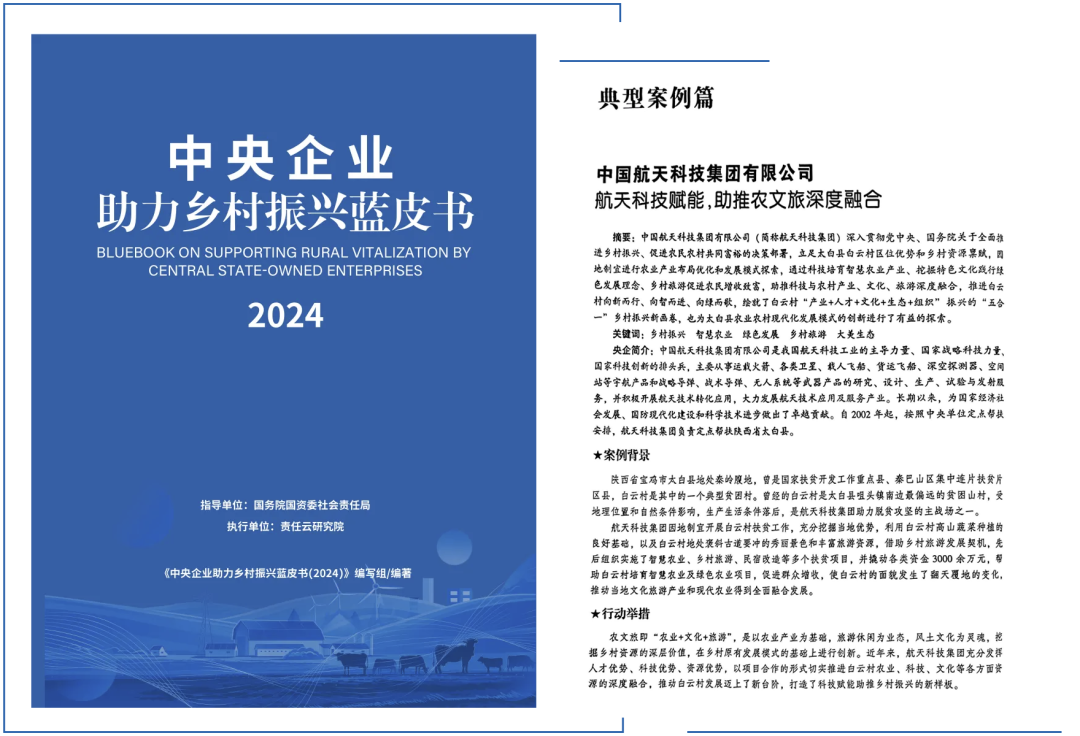 國務院國資委發布了《中央企業助力鄉村振興藍皮書(2024)》,集團公司《航天科技賦能,助推農文旅深度融合》案例入選。