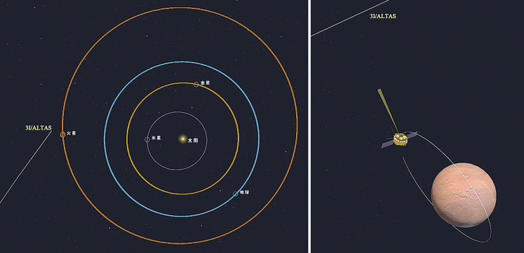 圖為星際天體阿特拉斯與天問一號火星環(huán)繞器相對位置示意圖(右圖是2025年10月3日相機拍攝時左圖的局部放大)。國家航天局提供