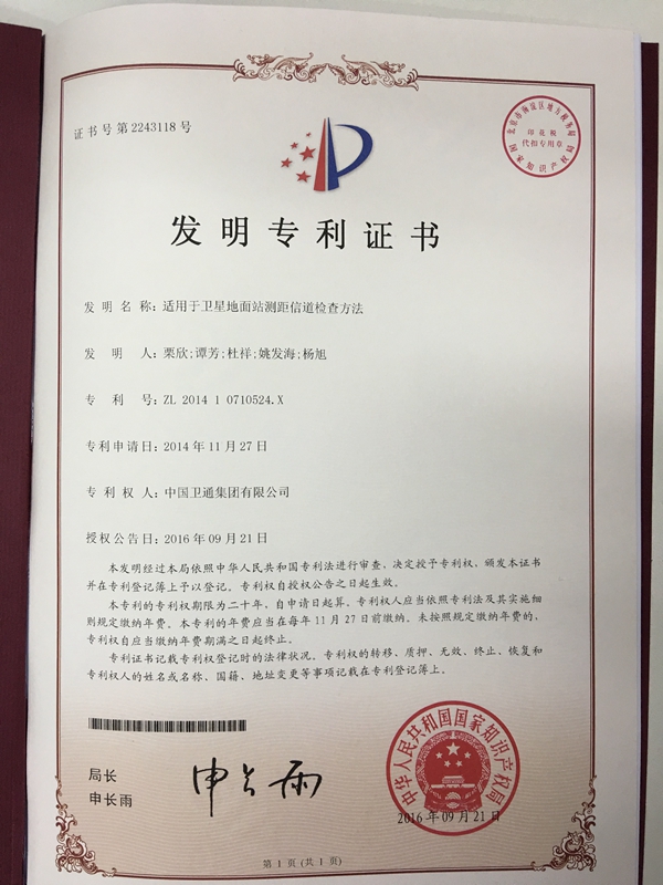 中國衛通首個專利于2016年9月21日獲得國家知識產權局授權。該專利名稱為《適用于衛星地面站測距信道檢查方法》,是一項發明專利,專利號:ZL 2014 1 0710524.X。這項專利是在開展集團科技創新項目《靜止軌道衛星多星統一測控管理系統研究與實驗系統研制》的研究工作過程中完成的,也是課題成果之一。此專利核心技術是發明一種計算算法,可以實現對衛星測控地面站測距鏈路上的設備可用性和連通性進行檢查計算,既可用于檢查當前測距路徑是否正確,也可用于查找可用測距路徑,對未來提高衛星測控操作效率有重要意義。