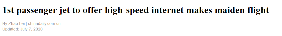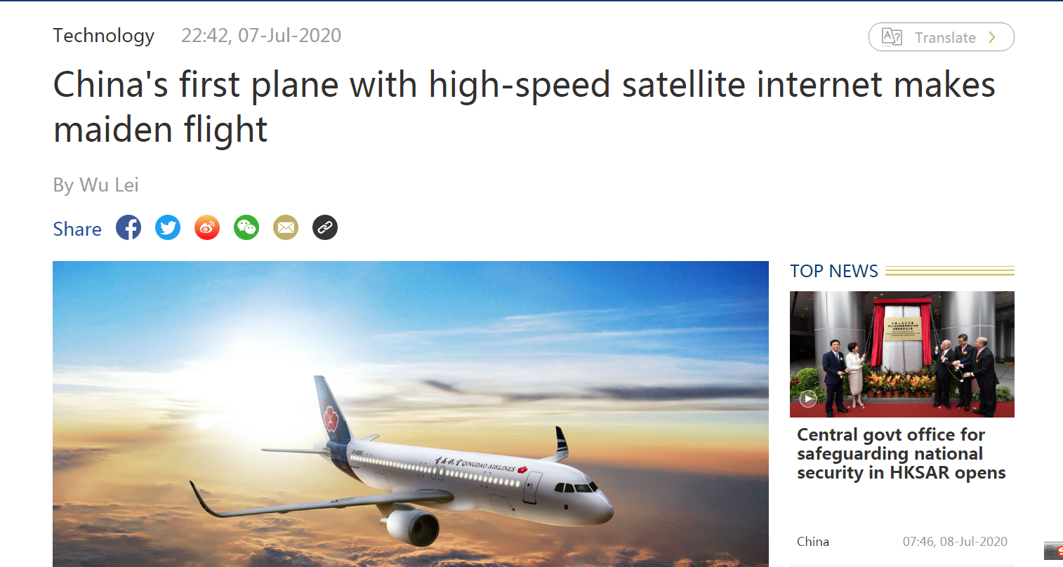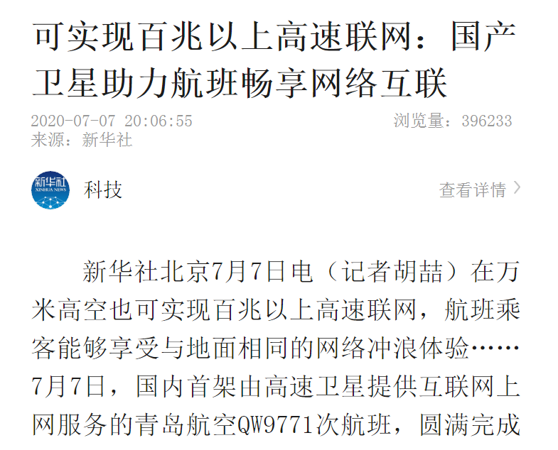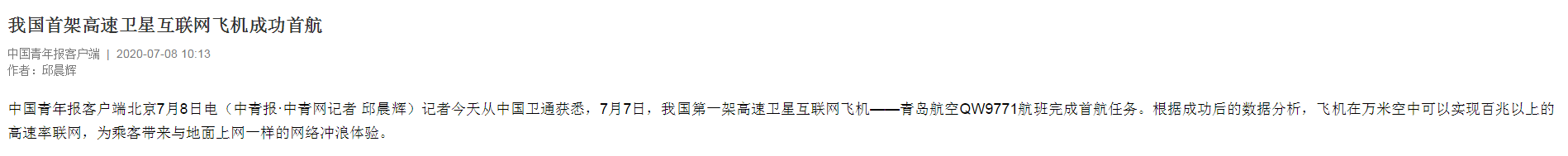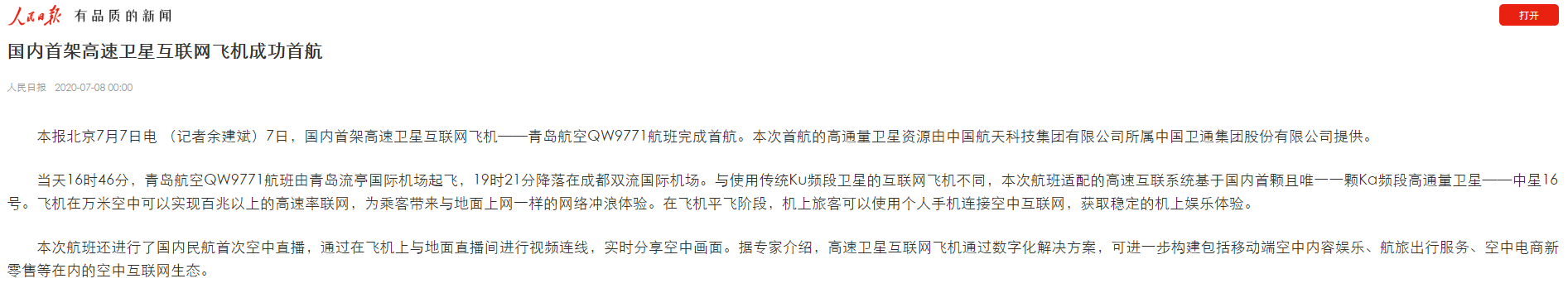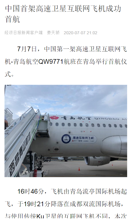 7月7日,國內首架高速衛星互聯網飛機——青島航空QW9771航班完成首航。本次首航的高通量衛星資源由中國衛通集團股份有限公司提供。