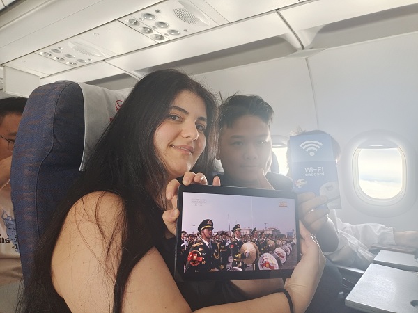 在萬米高空,中國衛通所屬星航互聯公司聯合四川航空,為航班乘客免費提供高通量衛星機上互聯網服務,突破地理空間限制,實現天地同步流暢觀看直播,讓人們無論身處何處,都能共同見證這一承載民族記憶的歷史時刻。
