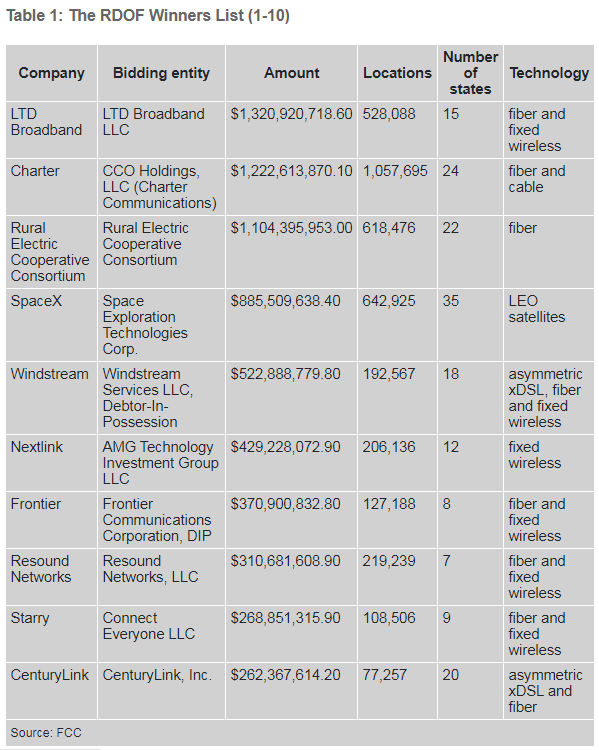 FCC在其“農村數字化機會基金”(Rural Digital Opportunity Fund)的第一階段拍賣中表示,Charter Communications公司贏得了12.2億美元,將為106萬個地點提供服務,而SpaceX公司則贏得了8.85億美元,將為64.2萬個地點提供服務。此外,農村電力合作聯社(Rural Electric Cooperative Consortium)贏得了11億美元,將為61.8萬個地點提供服務,LTD Broadband公司則贏得了13.2億美元,將為52.8萬個地點提供服務。